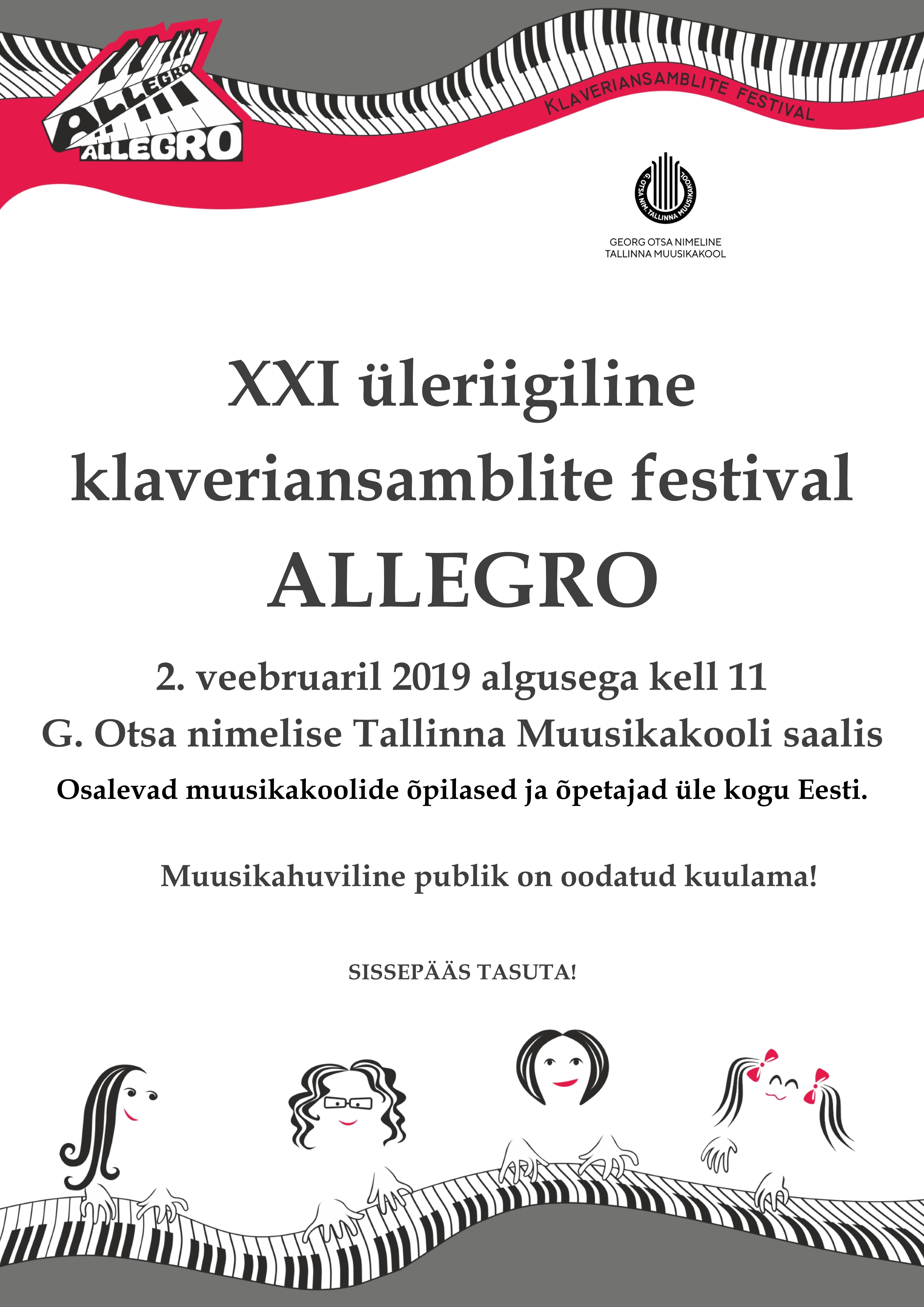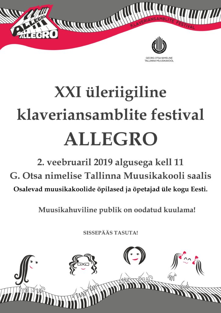 Georg Otsa nimelise Tallinna Muusikakooli saalis toimuval festivalil âAllegroâ astuvad ĂŒles Ă”pilaste ja Ă”petajate klaveriansamblid. Seekordsele festivalile on registreerunud mĂ€ngijad 16-st koolist: Aseri, JĂ”elĂ€htme, Kiili, Kohila, Kose, LasnamĂ€e, Paldiski, Rae, Tartu II Muusikakool. Tallinnast Triin-Maret Laulu Klaveristuudio, Tallinna Muusika Keskkool, PĂŒha Johannese Kool, Huvikeskus Kullo ja Georg Otsa nim Tallinna Muusikakool.