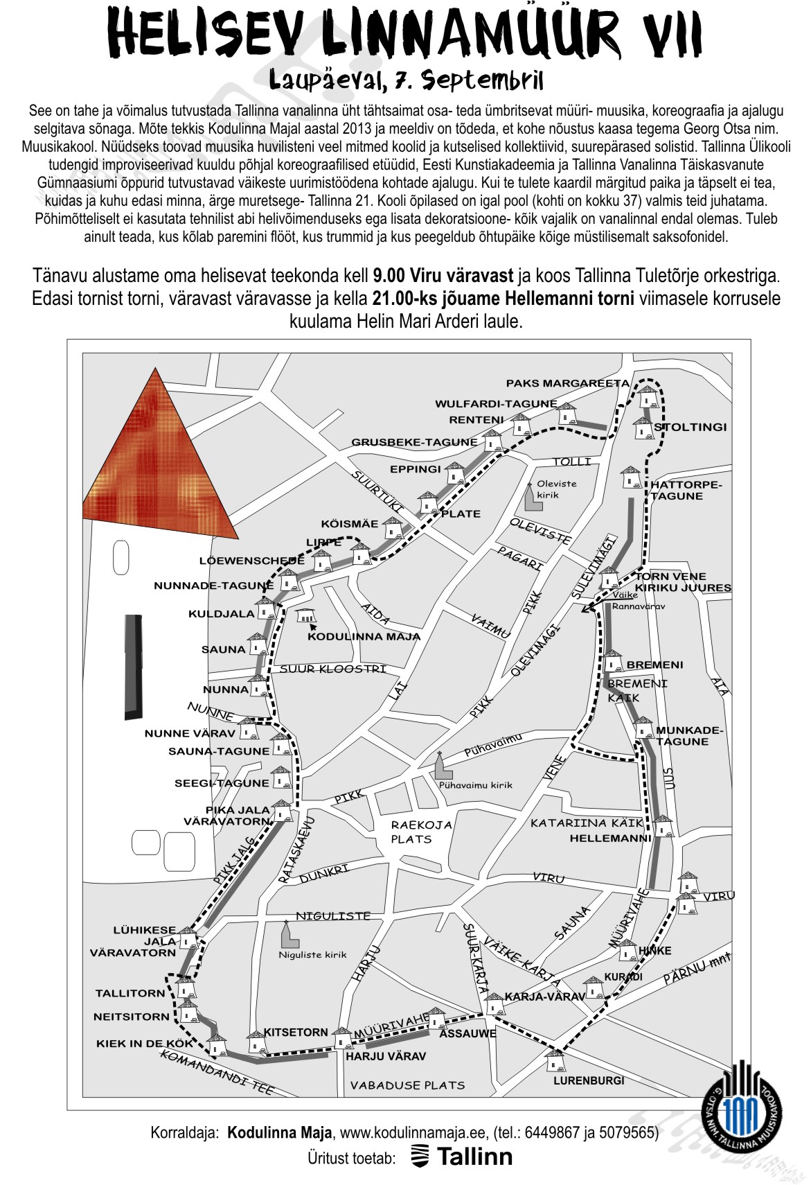 LaupĂ€eval, 7. septembril korraldab Kodulinna Maja juba seitsmendat korda ĂŒrituse âHelisev LinnamĂŒĂŒrâ. TĂ€navu alustatakse helisevat teekonda kell 9 Viru vĂ€ravast koos Tallinna TuletĂ”rje Orkestriga. NĂ”nda edasi tornist torni ja vĂ€ravast vĂ€ravasse. KĂ”ige lĂ”puks, kell 21, jĂ”utakse Hellemanni torni kuulama Helin Mari Arderi laule.