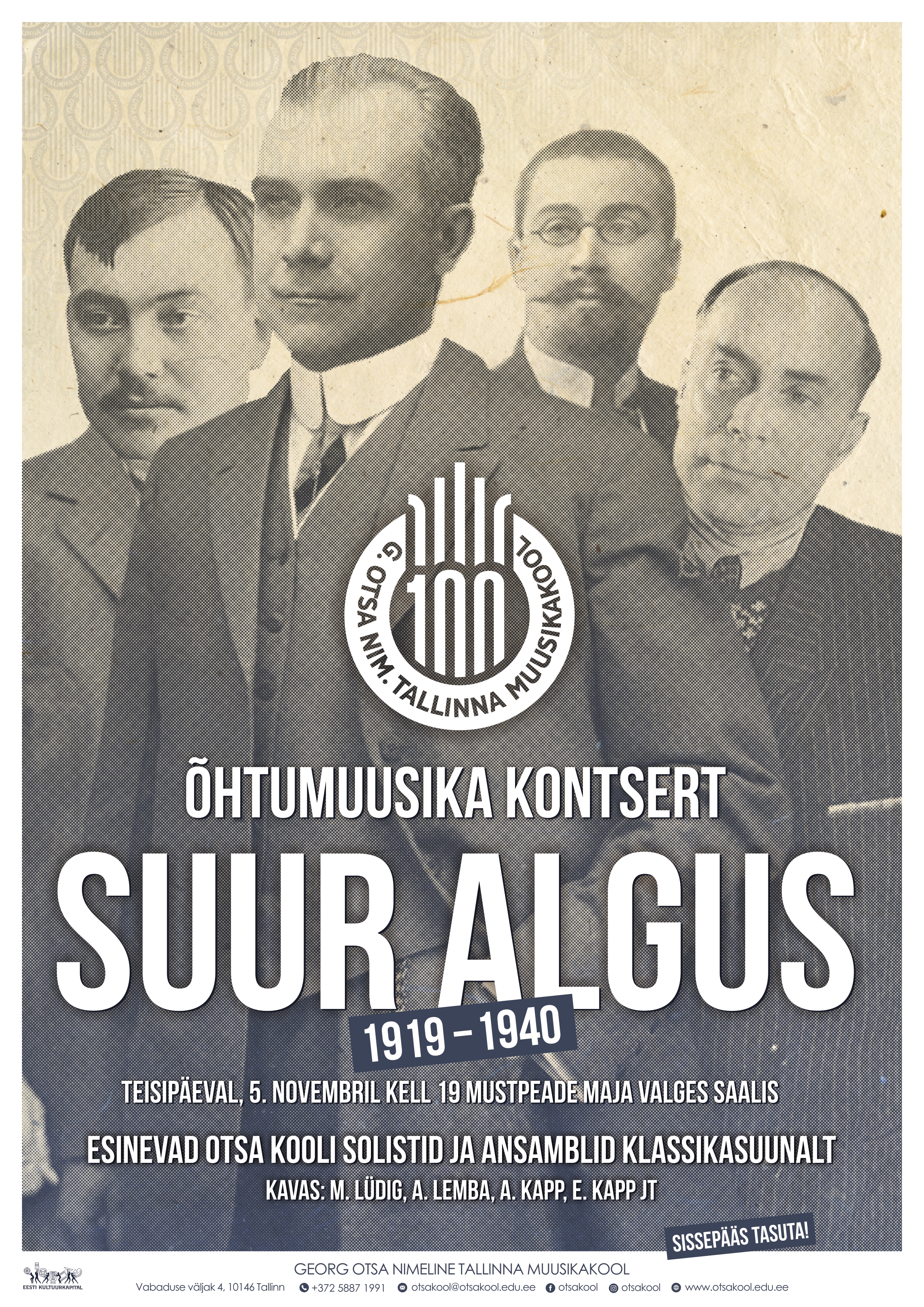 SUUL ALGUS (1919- 1940) – Mihkel Lüdig, Artur Lemba, Artur Kapp ja Eugen Kapp – aastad, kus kogu muusikaõpetus oli jagunemata, aga neil aastatel pandi alus ka kõigele järgnevale. Kõigi nelja looja loomingunäited olid ka 2019 aasta suvise juubelilaulupeo repertuaaris.