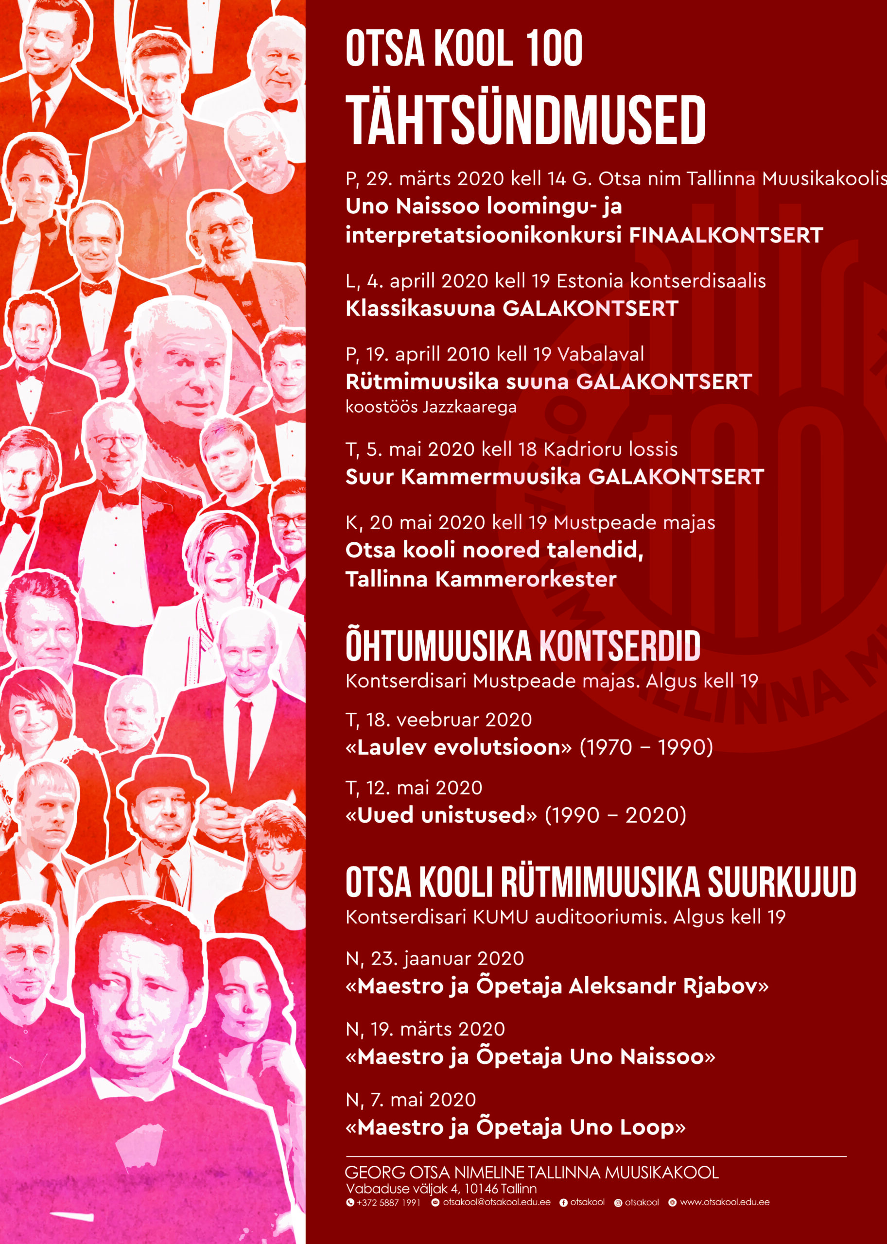 LaupĂ€eval, 4. aprillil 2020 kell 19.00 toimub Estonia kontserdisaalis Otsa kooli 100. sĂŒnnipĂ€evale pĂŒhendatud KLASSIKASUUNA GALAKONTSERT.