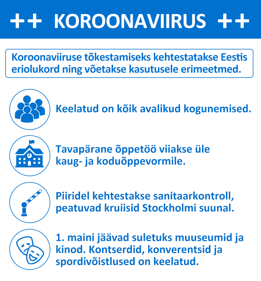 Koroonaviiruse leviku tÔkestamiseks on valitsus otsustanud kehtestada Eestis eriolukorra ning rakendada erimeetmeid: