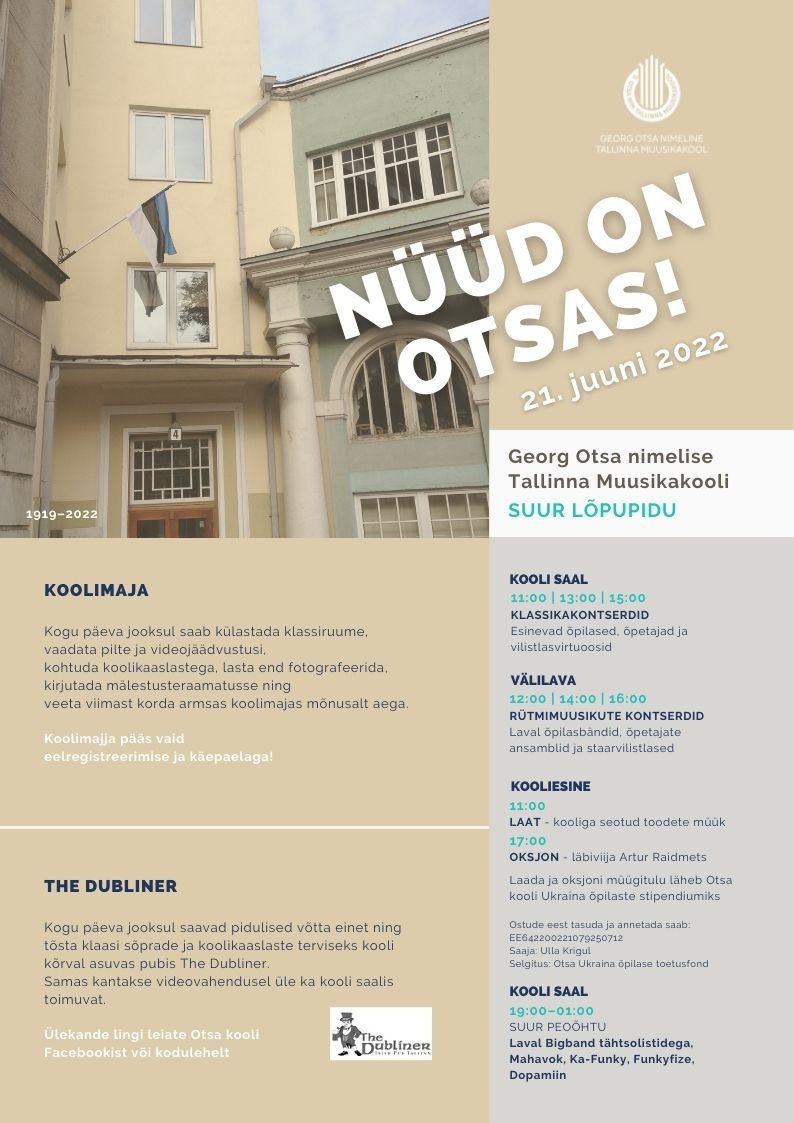 21.06.2022 toimus Georg Otsa nimelise Tallinna Muusikakooli SUUR LÕPUPIDU Ootasime külla kõiki praeguseid ja endisi õpetajaid ning õpilasi. Kogu päeva jooksul sai kuulata kontserte, külastada klassiruume, vaadata pilte ja videojäädvustusi, kohtuda koolikaaslastega, lasta end fotografeerida, kirjutada mälestusteraamatusse ning veeta viimast korda armsas koolimajas mõnusalt aega. PILDID (fotograaf Vahur Lõhmus) siin: Võlupeegli PILDID siin: (aitäh, fotoboks.ee !)
