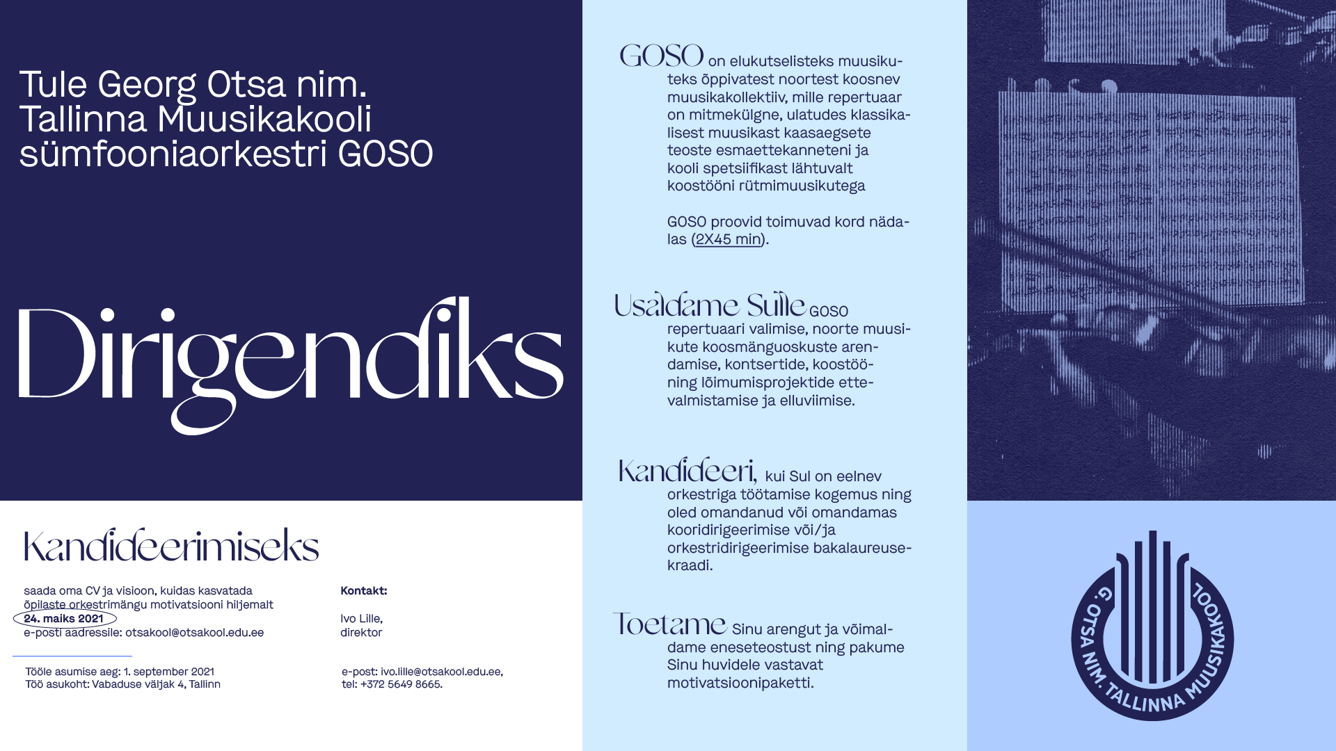 Kandideeri, kui Sul on eelnev orkestriga töötamise kogemus ning oled omandanud vÔi omandamas kooridirigeerimise vÔi/ja orkestridirigeerimise bakalaureusekraadi.
